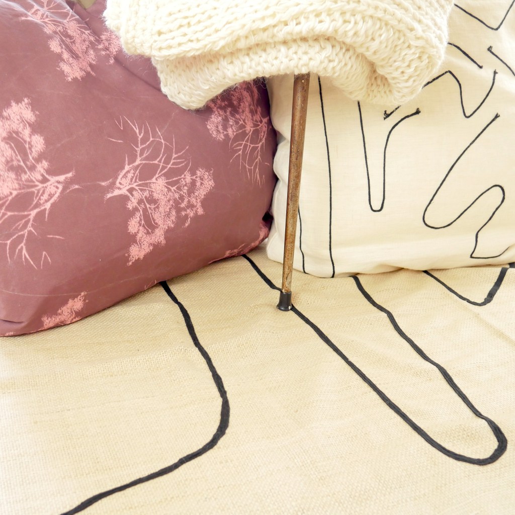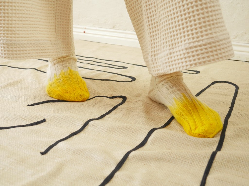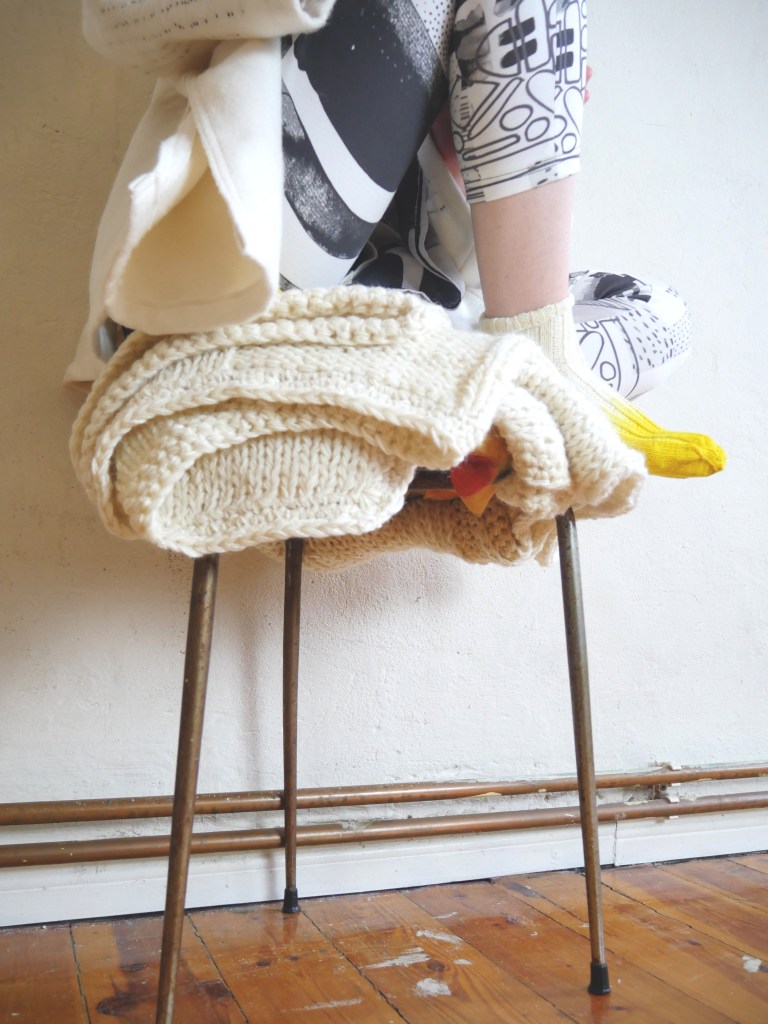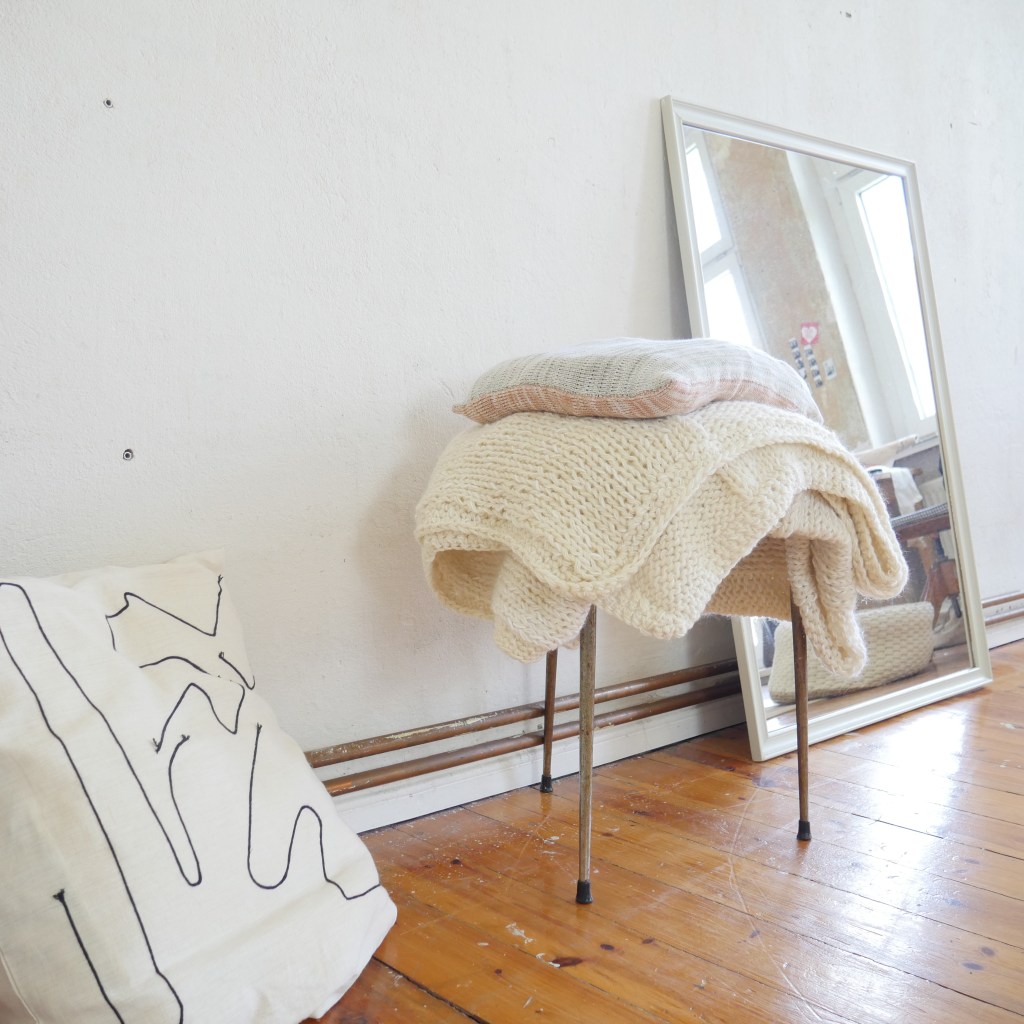während des Prozesses Objekte, welche künstlerisch an der Wand oder als Installation im Raum drapiert werden. Durch die Art der Präsentation wird die Verbindung und das Zusammenspiel von textilem Handwerk zur Kunst und zur Inneneinrichtung sichtbar.
