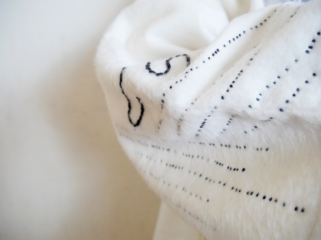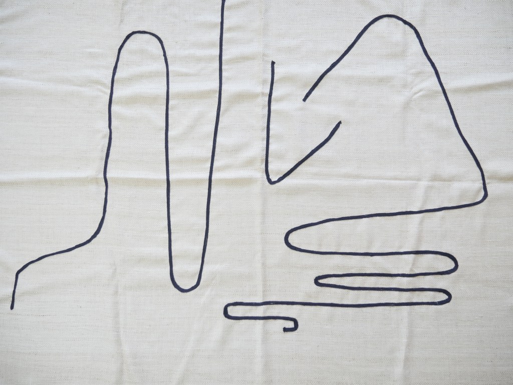 Hier findet eine Auseinandersetzung mit Materialien wie Plastik, Abfall und Textilien. Stickereien verbinden die natürlichen,- mit den für die Umwelt bedenklichen Materialien. Ab wann ist Abfall Abfall? Und Kunst Kunst? Muss Kunst immer aus neuen Materialien und Dingen bestehen? Die Handarbeitskunst Sticken verknüpft beide Elemente und stellt so einen Kontext zwischen Natur, Technik und Mensch her. So wird der Fokus auf unseren Müll gelenkt (bisherige Produktion, auf Gewinn und Technik ausgelegt) und mit dem ästhetischen des Textils und der Stickerei (unser eigentliche menschlicher Kern: das Soziale, das Arbeiten mit den eigenen Händen) verbunden. Gerade findet eine Transformation in diesem Bereich statt. Nachhaltigere Materialien werden entwickelt. Naturbelassene Materialien und Regionale Produktion und auch Rohstoffgewinnung findet wieder mehr statt und stößt auf mehr und mehr Interesse.
