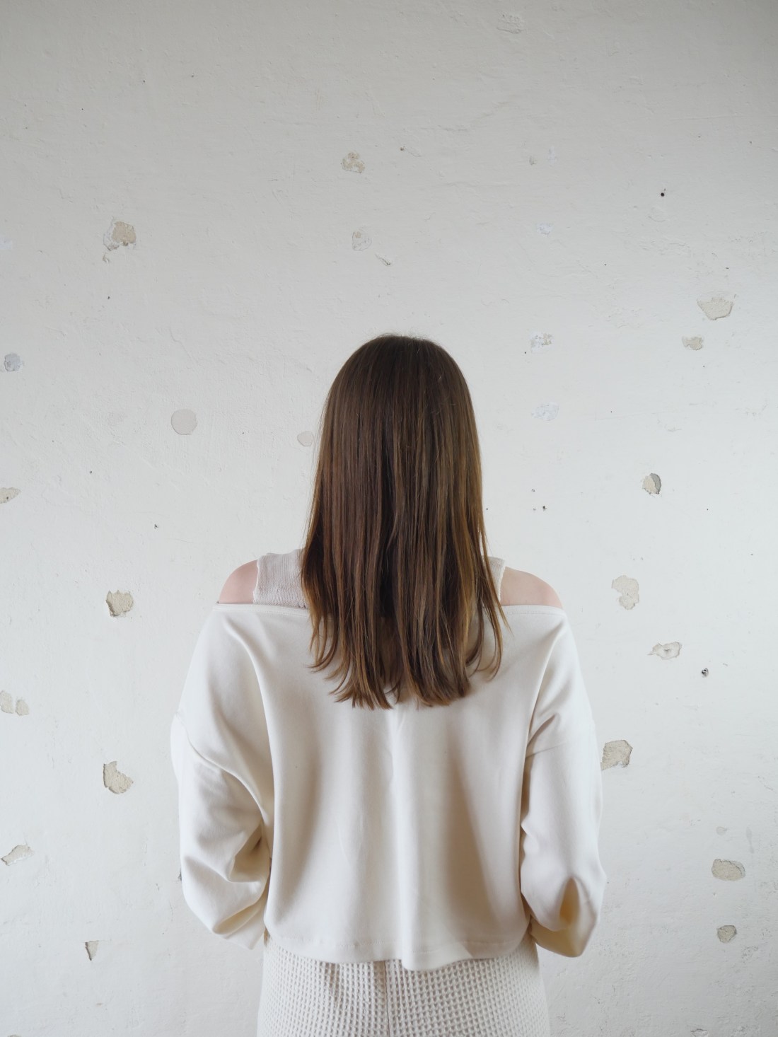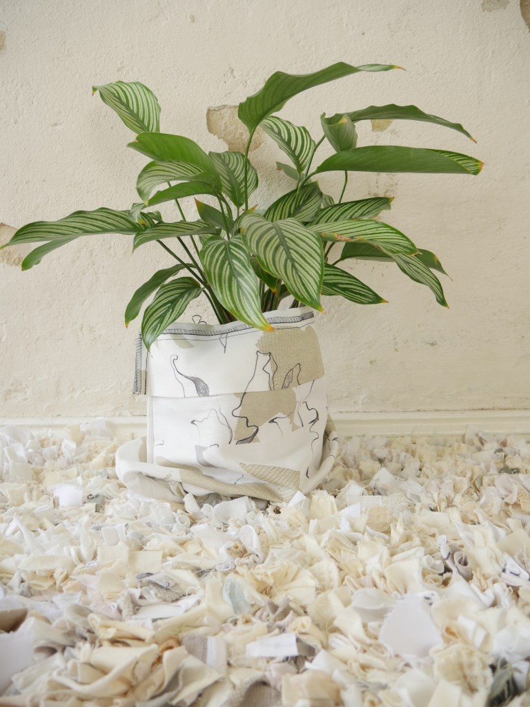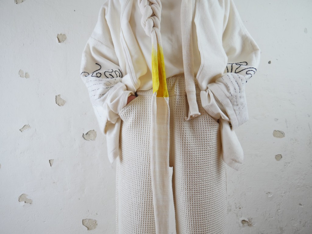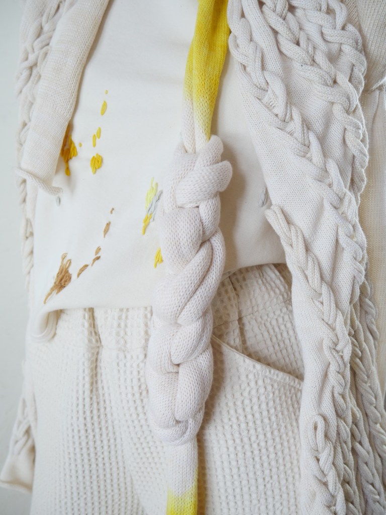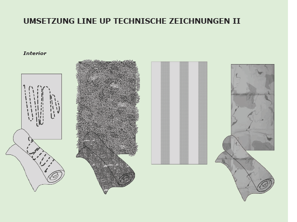 Die Kollektion besteht aus drei Kategorien: Kleidungsstücke, Interior- Textilien und die während des Prozesses entstandenen Objekte. Diese werden künstlerisch an der Wand oder als Installation im Raum installiert.